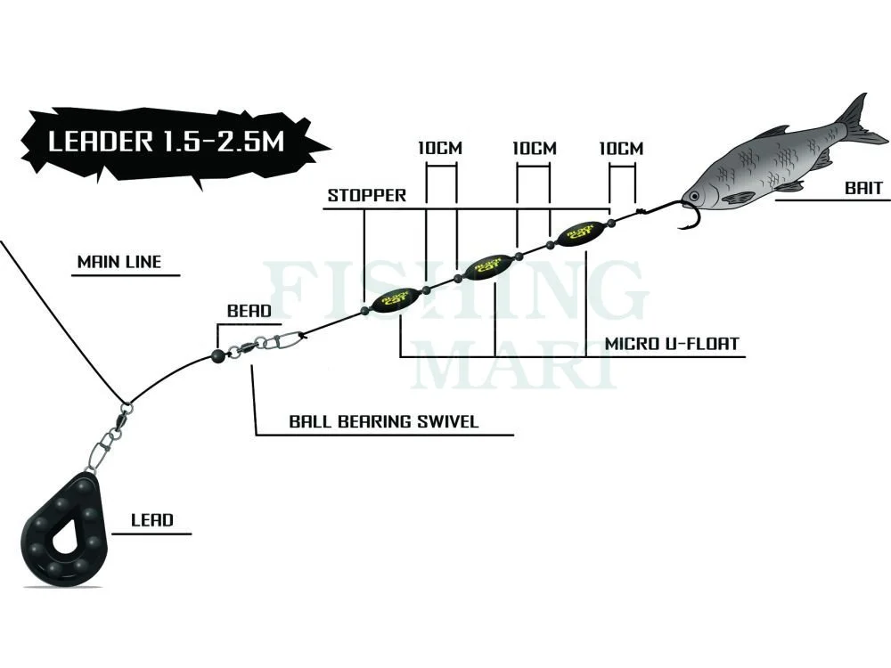 Małe, wrzecionowate pływaki, dostępne w gramaturach 1.5 g i 3.5 g nie są w ogóle zauważalne powyżej przynęty. Gwarantują świetne brania i pozwalają stworzyć atrakcyjny zestaw na wodach o dużej presji. Pływaki Micro U-Float pozwalają umieścić przynętę tuż nad dnem. W zależności od wielkości przynęty, jednocześnie można na przyponie umieścić kilka pływaków Micro U-Floats, co zwiększy pływalność zestawu i jednocześnie ograniczy zawirowania wokół przyponu. Nawet podczas łowienia w pobliżu kamieni, Stefan Seuß radzi stosować pływaki Micro U-Float do prezentacji praktycznie nieważącego przyponu i przynęty powyżej ostrych krawędzi kamieni. Pływaki w jasnych kolorach – neonowym żółtym i neonowym czerwonym, stosowane są w czystych wodach, dzięki czemu są wizualnym wabikiem dla sumów.
