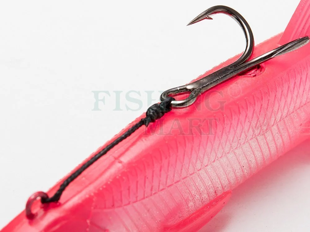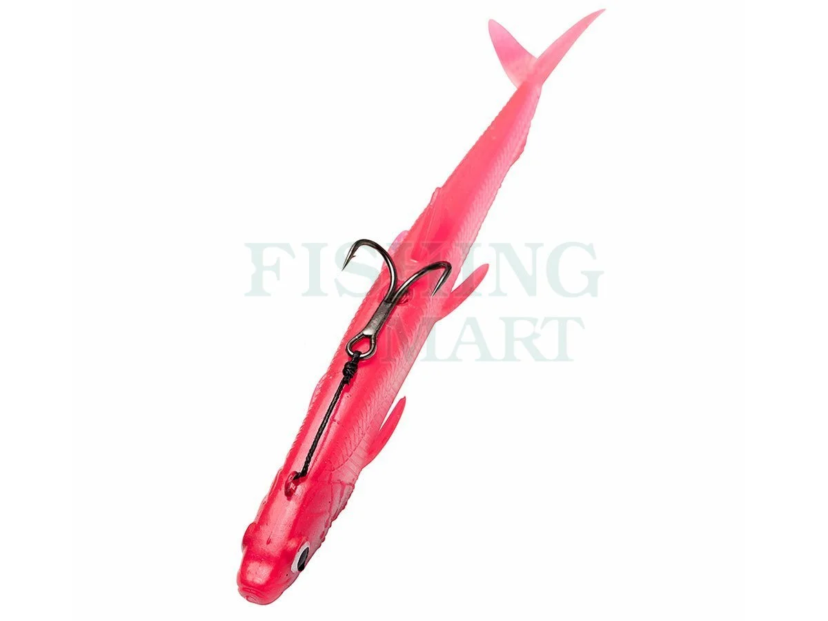 Sumy i czasami sandacze atakują tę przynętę tak mocno i połykają tak głęboko, że wyczepienie może być trudne. Zastosowany tu podwójny hak nie wbija się w korpus przynęty, dzięki czemu odhaczanie jest szybsze i bardziej bezpieczne dla ryb. Przynęta pokryta jest również atraktorem o aromacie stynki, który przyciąga sumy z dużych odległości.