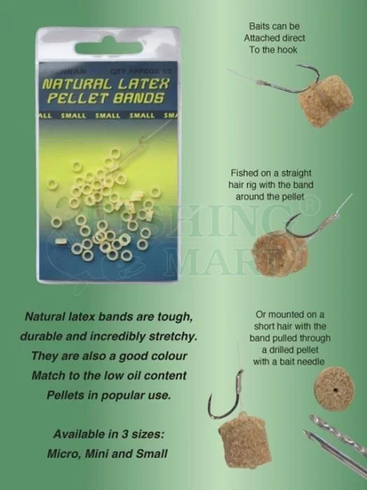 Gumki (ringi) wykonane z najwyższej jakości gumy lateksowej. Służą do montażu pelletu przy haczyku. Kolor naturalny lateks. Opakowanie zawiera 50 gumek.