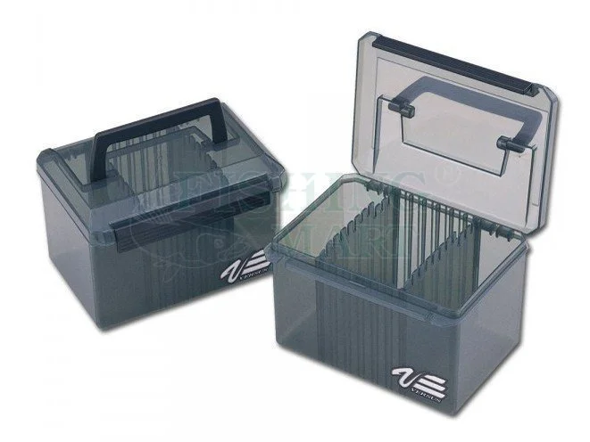 Niewielka skrzyneczka z górnym uchwytem. Dwie regulowane, użebrowane przegrody pozwalają na pionowe przechowywanie średnich przynęt. Po zdjęciu przegród otrzymujemy uniwersalne pudełko mogące służyć np. do przechowywania przynęt gumowych w woreczkach strunowych. Zamkniecie typu „One-Hand”. Pudełko jest kompatybilne z ze skrzyniami: 8050, 3080 i 3078.