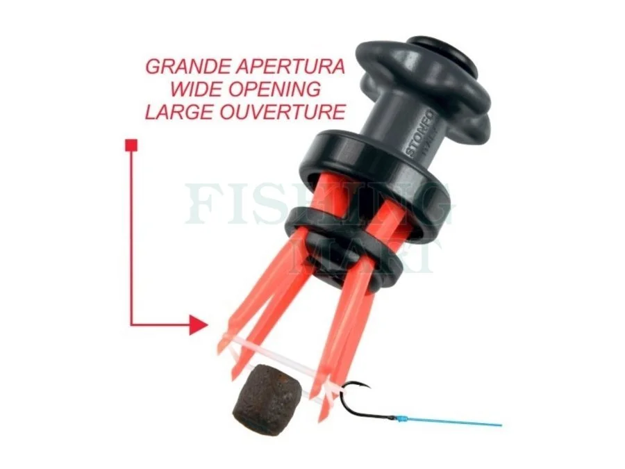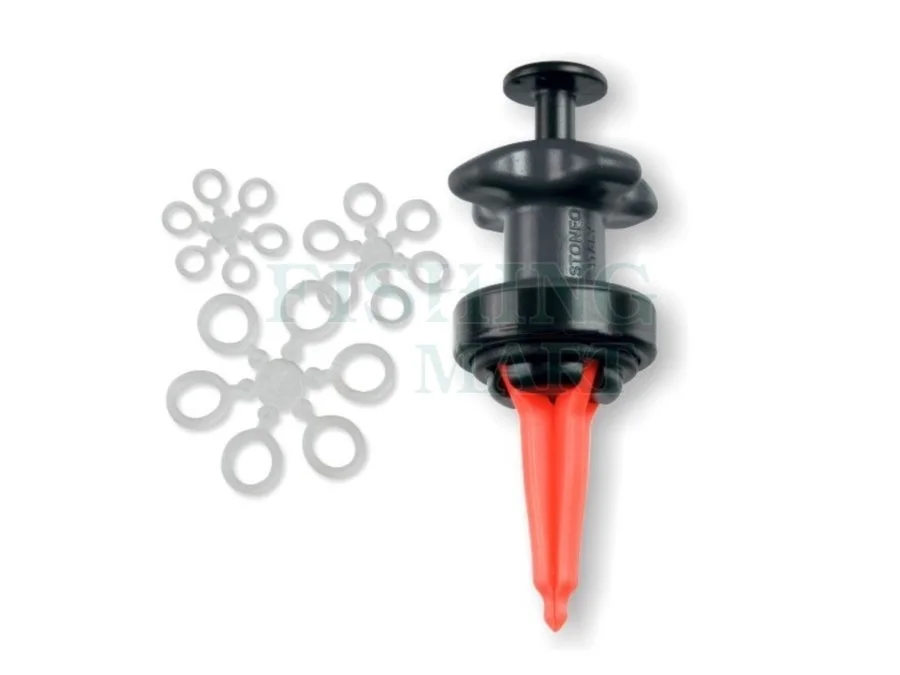 Dostarczany w zestawie z 24 gumkami o różnych średnicach odpowiednich do zakładania przynęt od 3 do 18 mm.